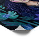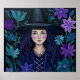 Mystical witch portrait: purple-haired woman in a wide-brimmed hat, pale skin and lace-up top amid vivid violet and teal flowers - moody gothic painterly.
