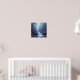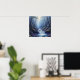 This whimsical poster features a serene forest scene with a gentle waterfall cascading over rocks, surrounded by lush greenery and hints of purple flora. Sunlight filters through the tall trees, creating a peaceful, mystical atmosphere. Finished as an oil paint art print.