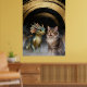 Two fantastical creatures with dragon-like scales stand amid swirling mist. Their cat-like features add a whimsical touch, set against a dramatic backdrop of gold and black rays. They have a look of surprise or shock on their face.