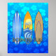 Retro Nacido En Surf. 3 tablas de surf de estilo vintage con el mensaje Born To Surf. Fondo azul oceánico con tortugas honu hawaianas y flores de hibisco azul.