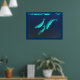 Cuenta con tres ballenas, Monodon monoceros, nadando bajo el hielo del Ártico. La ballena está relacionada con la ballena Beluga y vive en el Ártico durante todo el año. Se encuentran principalmente en las aguas de Groenlandia y Canadá, raramente al sur de los 65°N de latitud. Los machos pesan hasta 1.600 kilogramos (3.500 lb), las hembras pesan alrededor de 1.000 kilogramos (2.200 lb). El narguile más grande jamás encontrado pesaba 3.500 libras. Tienen forma de beluga y tienen unos cuatro centímetros de grasa aislante. Normalmente, las ballenas se congregan en grupos de entre cinco y diez individuos. En el verano, varios grupos se reúnen formando aglomeraciones más grandes. El narwhal se deriva de la palabra nár, que significa "cadáver", que se refiere a la pigmentación grisácea y moteada del animal, como la de un marinero ahogado. El narwhal es más oscuro cuando los jóvenes se vuelven más blancos con la edad. La característica más visible del narval masculino es su colmillo de 2-3 metros (7-10 pies) de largo torcido. Es un diente incisor que proyecta desde el lado izquierdo de la mandíbula superior y forma una hélice zurda. El nombre científico del narval, Monodon monoceros, se deriva de "una bocina con un solo diente". El colmillo puede ser de hasta 3 metros (9.8 pies) de largo, comparado con una longitud corporal de 4-5 metros (13-16 pies), y pesar hasta 10 kilogramos (22 libras). Aproximadamente uno de cada 500 machos tiene dos colmillos, que ocurren cuando el incisor derecho, normalmente pequeño, también crece. Una hembra narwhal también puede producir un colmillo, pero esto ocurre raramente, y hay un solo funda registrado de una hembra con doble colmillo. Se cree que este comportamiento mantiene jerarquías de dominación social. A veces, los narguiles machos frotan sus colmillos juntos en una actividad llamada "colofón". La razón de este comportamiento es desconocida; puede ser "rascar una picazón" (la base del colmillo suele estar infestada de piojos); o cruzar el colmillo puede ser un saludo amistoso. La teoría más ampliamente aceptada para el rol del colmillo es similar a la de un león o las plumas de cola de un pavo real. Puede ayudar a determinar el rango social, mantener jerarquías de dominación o ayudar a los jóvenes a desarrollar las aptitudes necesarias para el desempeño en funciones de adultos. Rara vez se han observado narices utilizando su colmillo para combatir u otro comportamiento agresivo o para romper el hielo marino en su hábitat ártico. El narwhal normalmente se desarrolla a un ritmo relajado, respirando lentamente y rodando, pero son notablemente rápidos cuando se sienten amenazados. A veces viajan en pequeños grupos familiares y se comunican a través de una gran variedad de chiles, trilladas, silbidos y clics. Los narcapales tienen una dieta relativamente restringida y especializada. Su presa está compuesta principalmente de fletán de Groenlandia, bacalao polar y ártico, camarón y calamar Gonatus. Entre otros elementos encontrados en los estómagos se encuentran el lobo, la capelina, los huevos para patinar y a veces las rocas, que se ingieren accidentalmente cuando las ballenas se alimentan cerca del fondo. Se desconoce cómo atrapan a sus presas. Algunos científicos creen que narwhal conmocionó a su presa con sonido como también a los delfines. El Narwhal muestra migraciones estacionales con alta fidelidad de retorno a terrenos de vertido preferidos sin hielo, generalmente en aguas poco profundas. En invierno, se encuentran principalmente en aguas submarinas, más profundas, bajo hielo gruesa manada, que surgen en fisuras estrechas en el hielo marino, o pistas. Narwhal de Canadá y West Greenland invierno regularmente en el hielo del Estrecho Davis y la Bahía de Baffin a lo largo de la vertiente continental con menos del 5% de agua abierta y densidades altas de fletán de Groenlandia. La alimentación en el invierno representa una porción mucho mayor de la ingesta de energía de narwhal que en el verano y, como depredadores marinos, son únicos en su exitosa explotación de los ecosistemas árticos de aguas profundas. La más notable de sus adaptaciones es la capacidad de realizar inmersiones profundas. Cuando en sus zonas de invierno, los narvales hacen algunas de las inmersiones más profundas jamás registradas para un mamífero marino, buceando a al menos 800 metros (2400 pies) más de 15 veces al día, con muchas inmersiones que llegan a 1500 metros (4500 pies). Las inmersiones a estas profundidades duran unos 25 minutos, incluyendo el tiempo que se pasa en el fondo y el tránsito hacia abajo y hacia atrás desde la superficie. En los terrenos de veraneo más bajo, los narvales se sumergen en profundidades de entre 30 y 300 metros. Los únicos depredadores de los narices además de los humanos son los osos polares y las orcas. A las personas inuit se les permite cazar legalmente esta especie de ballena para su subsistencia. El clima del norte proporciona poca nutrición en forma de vitaminas que sólo se pueden obtener mediante el consumo de foca, ballena y moras. Casi todas las partes del narval, la carne, la piel, la ubre y los órganos se consumen. Mattak, la palabra que significa piel cruda y grasa, se considera un manjar y los huesos se utilizan para herramientas y arte. En algunos lugares de Groenlandia, como Qaanaaq, se utilizan métodos tradicionales de caza y se arpan las ballenas a partir de kayaks hechos a mano. En otras partes de Groenlandia y el norte del Canadá se utilizan barcos de alta velocidad y rifles de caza. Si bien las poblaciones parecen estables, se ha considerado que el narval es particularmente vulnerable al cambio climático debido a una estrecha variedad geográfica y a una dieta especializada. Los relatos que han entrado en cautiverio tienden a morir rápidamente. En la leyenda inuit, el colmillo del narval se creó cuando una mujer con una cuerda de arpón atada alrededor 
