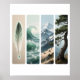Cuatro paneles de arte natural con plumas, olas, montañas y árboles. Decoración de boho para las impresiones de pared y revistas.