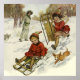 Ilustracion de la Vintage. Imagen de feriado navideño con felices chicas y muchachos jugando y durmiendo en una colina cubierta de nieve el Día del Navidad. ¡El hermano y la hermana se están divirtiendo con su nuevo tobogán mientras su mascota perrito aterrador se está divirtiendo también! ¡Saludos de temporada!