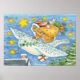 Ilustracion de la Vintage. Imagen de feriado navideño con un bonito conejo vestido como un alegre Santa Claus con un saco lleno de comida de conejo (lechuga y zanahorias) y juguetes. Santa Rabbit vuela sobre un búho en lugar de un trineo y el búho lleva un regalo en sus garras, una rama de olivo para simbolizar la paz.