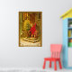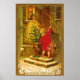 Vintage tarjeta de Navidades húngaros convertida en arte mural. Una niña pequeña con abrigo rojo sostiene un árbol y hace sonar el timbre de la puerta. Aunque no parece pobre -está descalza. El texto de Kellemes unnepeket - significa fiestas felices en húngaro. También puedes leer un mensaje escrito a mano .