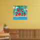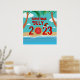 Navidades en el ilustracion de julio de 2023 con el audaz año rojo 2023 decorado con una colorida cadena de luz, una sandía rebanada y un gorra de Santa Claus rojo. Se exhiben en la playa con palmeras y agua del océano.