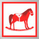 Este impresionante poster de Navidades presenta una imagen de arte digital de un lindo caballo balancín al estilo escandinavo. El caballo es rojo con un mané rojo oscuro, cola y pezuñas. El caballo amistoso sonríe. Tiene una silla blanca y riendas con motivos folclóricos escandinavos bonitos en la silla, incluyendo el sol, la luna y las estrellas y los corazones y flores. La base del mecedor es roja y está cubierta de hojas blancas de bonito. El diseño se inspiró en el caballo Dala sueco.