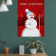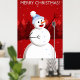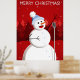 Poster de Navidades educados con un ilustracion de un muñeco de nieve feliz cantando con un micrófono sobre fondo rojo brillante y el texto "Feliz Navidad". La nieve está cayendo, las copas de nieve por todas partes y se puede ver un bosque de pinos en el fondo.