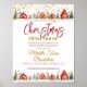 Una magnífica invitación de poster de Negocios Open House para Navidades. Este glamoroso diseño dorado y rojo de vacaciones cuenta con una escena callejera nevada con casas y árboles. Fácil de personalizar con sus propios detalles fiestas de la casa abierta de vacaciones.