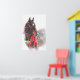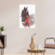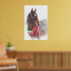 Navidades Pony - una bahía oscura que lleva una corona con un arco rojo y campanas de jingle, con la nieve cayendo. Una preciosa imagen del tiempo de los Navidades, adecuada para la decoración de los Navidades en una casa de caballos o en una habitación de tachuelas.