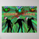 Tres Navidades disco zombies con sombreros de Santa y de fiesta la noche bajo los coloridos espejos bolas disco con luces láser verdes, azules y naranjas rebotando en la pista de baile.