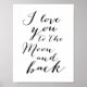 Tipografía negra Te amo a la Luna y el poster de atrás impreso en fondo blanco. Las dimensiones de la huella de signo (poster) son de 8,5 pulgadas por 11 pulgadas. También se puede añadir un marco de madera negra estándar o madera personalizado o un marco metalizado disponible en 42 colores diferentes.