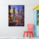 A vibrant alien city square glows under a radiant sunset, where warm golden light blends seamlessly with neon reflections of teal and magenta. Futuristic architecture rises in layered forms, with curved facades, suspended structures, and luminous details creating a rich urban environment. Empty streets and scattered objects suggest life beyond the frame, adding a sense of quiet narrative and atmosphere. Reflective surfaces and soft haze enhance the cinematic depth, making the scene feel alive and immersive. This artwork is perfect for modern interiors seeking bold color, futuristic design, and striking visual energy.