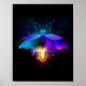 Luciérnagas mecánicas antiguas con bombilla de luz y finas alas brillan naranja, violeta, turquesa sobre fondo negro. Estilo Steampunk.