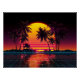 Silhouetted palm trees frame a massive glowing sun striped in retro orange and pink against a starry night sky. A luminous cyan grid stretches across the foreground, its perfect reflections shimmering on the water-like surface below. This iconic synthwave scene pulses with 80s nostalgia and futuristic tropical vibes, ideal for posters, canvas prints, phone cases, mousepads, throw pillows, and décor that brings bold vaporwave energy to any space.