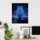 A commanding neon owl perches high above a futuristic city skyline, glowing with electric blue, violet, and cyan contours. Its luminous eyes and symmetrical form create a powerful centerpiece against distant skyscraper lights, rooftop shadows, and moody midnight haze. Clean futuristic lines and elegant nocturnal energy make this design both striking and sophisticated. Perfect for gaming rooms, offices, bedrooms, or collectors who love owls, urban night scenes, and sleek cyberpunk style.