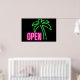 Texto "abierto" de color rosa neón con silueta de palmera tropical verde neón sobre fondo negro hace de esto un gran diseño para tiendas y negocios personales y una variedad de tiendas minoristas