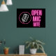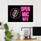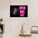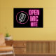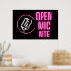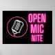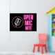 El texto "Open Mic Nite" de color rosa neón con una silueta de micrófono estilo retro de neón sobre fondo negro hace de esto un gran diseño para una variedad de eventos desde el bar del barrio y la cafetería de la casa de micrófono abierto a los fiestas temáticos para la familia y amigos