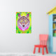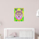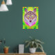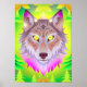 Ilustracion digital colorido de la cara de un lobo con colores vibrantes de neón y fondo boscoso abstracto.