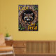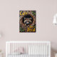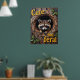 Esta entrañable obra de arte muestra un mapache saliendo de un gran nido circular marrón integrado en una pared de madera. La mirada del mapache es directa y cautivadora. El fondo de madera es oscuro y está muy cuidado, con pequeñas hojas verdes que le dan un toque de color. El texto "'Cute but feral'" es una adición lúdica, con un tipo de letra elevado y amarillo.