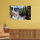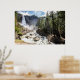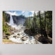 Esta foto muestra el invierno tardío en las Cataratas de Nevada en plena fluidez y el agua se desliza por la cara del acantilado y se vuelve a tomar en el río merced mientras pasa rocas y abetos.
