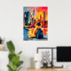 Vibrant New York teddy fauvist artwork featuring a contemplative teddy bear traveler with backpack overlooking the Manhattan skyline and One World Trade Center at sunset. Bold fauvist color planes and structured geometric reflections create striking wall art perfect for NYC lovers, nursery decor, and modern interiors.