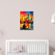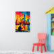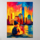 Vibrant New York teddy fauvist artwork featuring a contemplative teddy bear traveler with backpack overlooking the Manhattan skyline at sunset. Bold fauvist color planes and structured geometric reflections create striking wall art perfect for NYC lovers, nursery decor, and modern interiors.