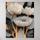 Este trío floral de pétalos crema con hojas estampadas presenta una ilustración botánica estilizada que incluye tres flores de tonos crema con texturas de líneas verticales finas y centros naranja cálidos. Las hojas circundantes en azul, blanco y naranja muestran intrincados patrones de puntos y líneas, todo sobre un fondo negro profundo que amplifica el contraste y el detalle de la obra de arte. Diseñado en una proporción versátil de 4:5, esta descarga digital de alta resolución aporta una artística luminosa y un encanto artesanal a cualquier espacio, perfecto para enmarcar, regalar o mejorar la decoración de su hogar con una elegante elegancia de jardín. #DescargaDigital #floralmoderno #ilustracióndepatrones #artedegráficos