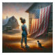 Una linda niña parada frente a una gran bandera estadounidense colgando de un antiguo granero rústico con su gatito.