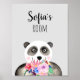 Este hermoso y femenino póster para niños presenta un oso panda pintado a mano que sostiene un ramo de flores. Este diseño de acuarela floral también incluye un espacio para que agregues el nombre de tu niña. ¡Perfecto para cualquier habitación de niños o guardería de bebés!