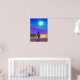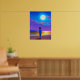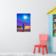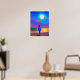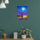 Poster en el ilustracion de un niño en la playa por la noche, mirando a la luna llena y al cielo estrellado