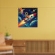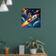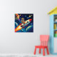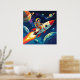 Poster de ciencia ficción para la habitación de un niño con un pequeño astronauta volando por el espacio en un barco de cohetes hecho en una forma de arte pop retro al estilo de un libro de historietas.