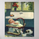 Imagen de ilustracion vintage de niños y bebés con un bebé dormido en su trona. El perro mascota de la familia también está tomando una siesta en el suelo de la cocina.