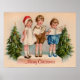 La imagen original es de los años 1800, mostrando a tres encantadores niños cantando Navidades Carols como en un espectáculo de Navidades en la escuela. Crea un gran poster de Navidad vintage.