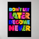 Hazlo ahora. Es ahora o nunca. Este diseño presenta una cita motivacional "No dejes que más tarde te conviertas en nunca" que aumentará tu confianza. Este inspirador diseño "No dejes que después te conviertas en nunca" es perfecto para ti o para cualquiera que ame estar inspirado. Agarra por ti mismo o sorprende a tus amigos, familia y colegas con este regalo inspirador. ¡Disfrútalo!
