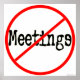 No Meetings slogan sarcástico de humor en letras distorsionadas con un círculo rojo y una línea. No te atrapes en una reunión en el trabajo, muéstrales cómo te sientes realmente con este dicho gracioso.