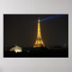 Esta es una foto de la Torre Eiffel en París, Francia. Esta foto fue tomada de noche. La Tour Eiffel está iluminada por la noche, iluminando la ciudad de la luz. Una faro rota alrededor de la cima de esta famosa y popular atracción turística. La Torre Eiffel es un emblemático monumento parisino.