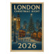 Navidades mágicos poster nocturno de Londres, escena nocturna nevada con Big Ben y Tower Bridge brillando bajo luces festivas, bus tradicional rojo de dos pisos