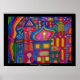Influenciado por Hundertwasser esta pintura muestra una parte colorida de mi ciudad, Berlín-Neukölln. Se puede ver el estilo árabe y la arquitectura de estilo europeo mezclados de una manera imaginativa. Las estrellas brillan desde un cielo azul nocturno. Cuatro elefantes pequeños caminan delante de las casas. En el lado izquierdo de la pintura, un arco iris está encontrando su camino como una calle. Marcadores de madera de Carina Rainbow, Berlín 2011.