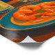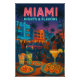 Afiche de viajes retro de Miami, Florida, EEUU, celebrando la vida nocturna y la cultura de la comida. Ocean Drive, iluminado por neones, con brillantes edificios Art Déco, palmeras oscilando bajo un cielo nocturno morado azul