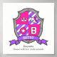 El escudo estilo Caballero escudo letra B monograma poster de nombre de arte perfecto para un dormitorio de chicas o sala de juegos en tonos rosa, púrpura, blanco y gris. Personalice con el nombre y el nombre de su hijo el significado de un toque personalizado al dormitorio o guardería de su hijo, este ejemplo es para el nombre de Betsy Exquisite, bendecida con el encanto, totalmente adorable. Dibujo único de la pantalla de la heralía con tiara de la corona, unicornio, arte y diseño de Sarah Trett. www.sarahtrett.com para www.mylittleeden.com