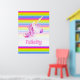 Póster personalizado para habitación de niñas con cabeza de unicornio y rayas de arcoíris rosa brillante. Personalice con el nombre de su elección, este ejemplo dice Felicity. Ideal para niñas coloridas para alegrar una habitación o sala de juegos. Otros productos coincidentes disponibles. Arte de acuarela original y diseño gráfico de Sarah Trett para www.mylittleeden.com