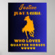 Este poster es perfecto para cualquier chica que tenga pasión por los caballos. Con un vibrante esquema de color azul y naranja, presenta el divertido y divertido mensaje "Just a Chica Who Loves Quarter Horses" en letras audaces y elegantes. El diseño también incluye una silueta de un caballo, que hace hincapié en el tema y añade un elemento de interés visual. Es más, este poster puede ser personalizado con un nombre, lo que lo convierte en una adición verdaderamente única y especial a cualquier dormitorio o espacio habitable. Tanto si eres un ecuestre experimentado como si simplemente te gusta la gracia y la belleza de los caballos, este poster le dará un toque de personalidad y encanto a cualquier habitación.