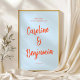 Esta señal de bienvenida para la boda presenta los nombres de la pareja en una escritura naranja cálida y grande sobre un fondo azul suave, con "Bienvenidos a la boda de" en letras pequeñas y limpias en la parte superior y la fecha de la boda debajo. Es simple y audaz: los nombres son todo el diseño, lo que lo hace sentir personal e intencional. Colóquelo en un caballete en la entrada del lugar para saludar a sus invitados. Se coordina con los anuncios de "guarda la fecha", invitaciones y papelería a juego en el mismo estilo suave azul y naranja.