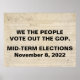 Nosotros, el pueblo, votamos por el Partido Republicano en las elecciones de mitad de mandato, 8 de noviembre de 2022. Votar en el medio de los mandatos es lo más fácil y lo menos que se puede hacer para ayudar a mantener la democracia y los derechos civiles. El Partido Republicano está destruyendo alegremente sus derechos porque los republicanos pasaron los últimos 50 años votando en cada elección, desde el gargateo local hasta el presidente de Estados Unidos. Votar en contra del Partido Republicano en todos los niveles puede empezar a revertir todas las políticas represivas y anti-personas que han estado promoviendo y promulgando en los últimos 50 años. Los republicanos no presentaron tres jueces contra el aborto en la Corte Suprema porque votaron, no sólo por Trump en 2016, sino por senadores durante años, y por miembros de la Cámara de Representantes y candidatos locales que ayudan a recaudar fondos y publicitar a esos senadores. Los republicanos quieren que se les dé el control a los Estados Unidos porque piensan que la gente razonable no vota en las elecciones estatales y locales, y desafortunadamente, han tenido razón. Ahora es el momento de cambiar eso. Informarse, involucrarse, sacar al GOP. Descripción del diseño: Antecedentes: La primera página de la Constitución, incluyendo el preámbulo We the People y el comienzo del artículo I, que enumera el poder y la autoridad de la legislatura. Superpuesto por eso están las palabras: "Nosotros, el pueblo, votamos por el Partido Republicano". Debajo hay dos plantillas para el tipo de elección y la fecha de la elección. Como se muestra, las plantillas dicen "Elecciones de mitad de período, 8 de noviembre de 2022".