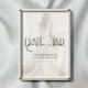 Diseño elegante y elegante, con una novia acuarela vestida con su traje boda, una tipografía moderna y flores de primavera sobre una marible en la parte trasera.El texto puede ser fácilmente personalizado para un diseño único y amable para su día especial.