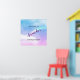 Poster de cumpleaños de bienvenida con una imagen de fondo suave y encantadora. Tonos azules y nubes rosas con un arcoiris mágico.