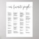 Tabla de asientos para bodas invitados en blanco y negro clásico con "Nuestra gente favorita" en la parte superior con letras de caligrafía manuscritas extrañas, con sus asignaciones de mesa de invitados debajo, ordenadas alfabéticamente en cuatro columnas.