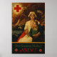 Un poster de la Primera Guerra Mundial muestra a una enfermera de la Cruz Roja sosteniendo a un joven chica, con cuatro jinetes representando la guerra detrás. Creado por Cornelius Hicks.