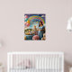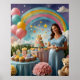 Disfrute de un ambiente tranquilo y caprichoso en el jardín con este reconfortante arte mural, que cuenta con una mujer embarazada rodeada de arcos de lluvia, sol y nubes onduladas. La escena refleja la esencia de una ducha de bebé muy alegre, con una mesa decorada con pasteles, regalos y decoración de temática de los bebés, todo ello en suaves tonos pastel. Una cita elegante, "Nuestro bebé arcoiris está llegando", agrega un emotivo sentimiento, bellamente enmarcado con letras suaves y fluidas. Las suaves pinceladas y los cálidos colores pastel crean un ambiente acogedor, haciendo de esta pieza un lugar perfecto para la decoración de vivero o como un regalo especial para los padres que esperan que celebren su milagro.
